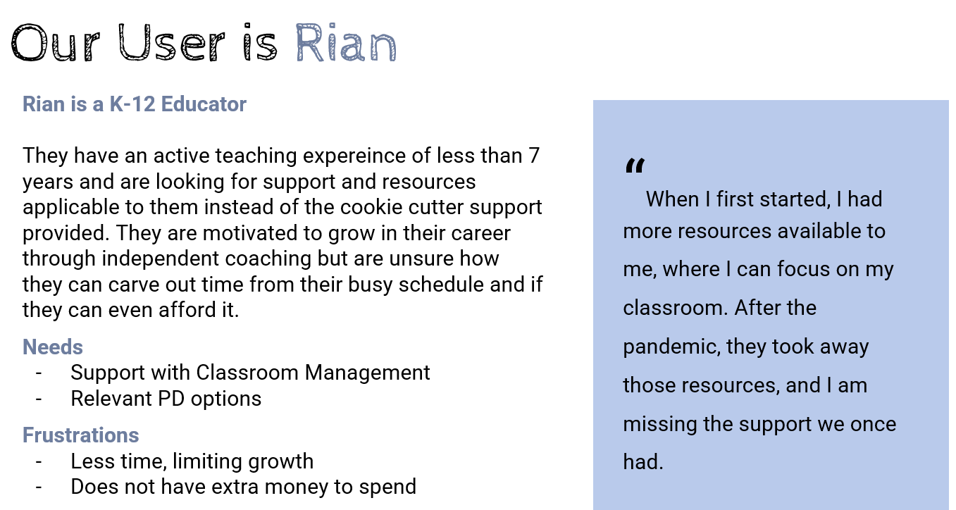 As we defined our problem statement for the user, we noted that teachers have time and financial constraints, and they need additional support outside what their districts has provided to meet their professional development goals.